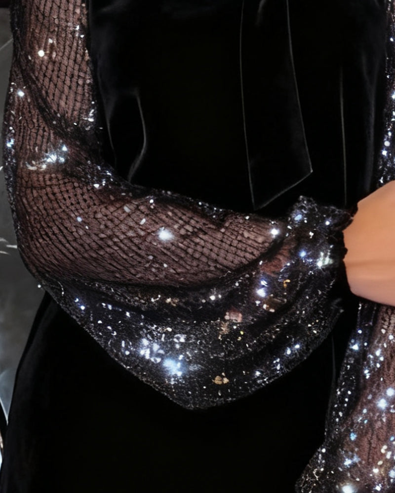 Elegant Dress with Lantern Sleeves and Patchwork